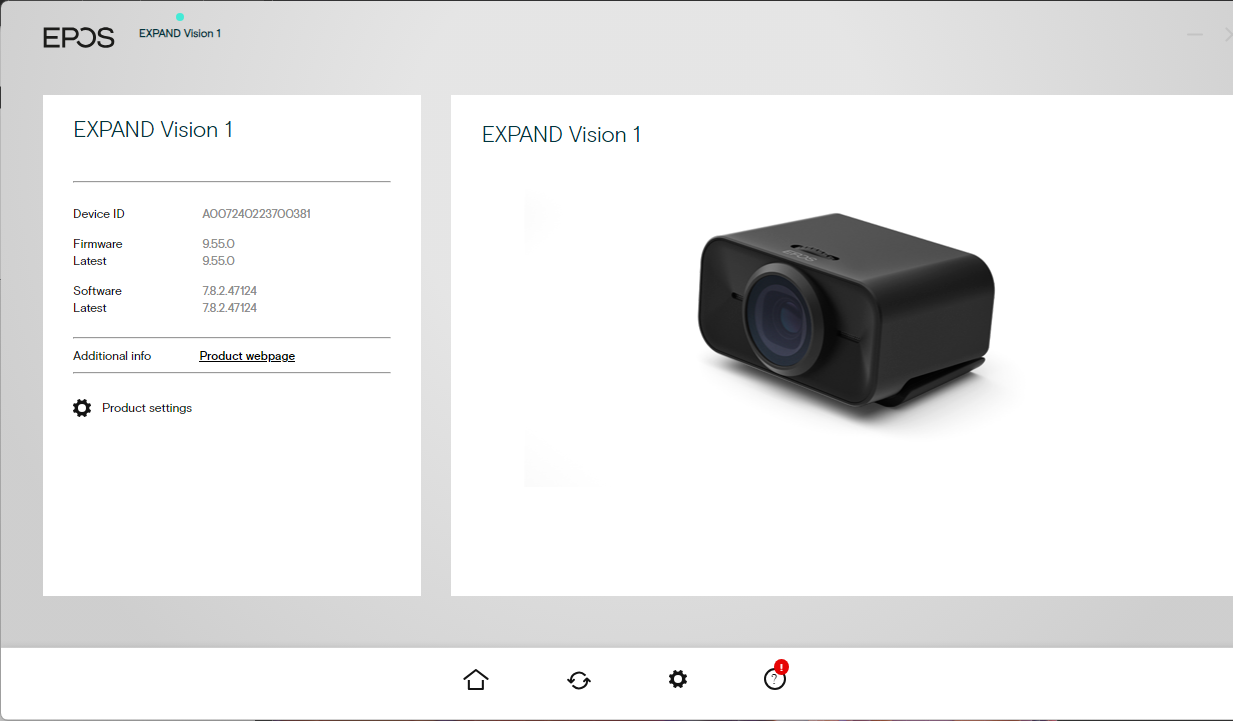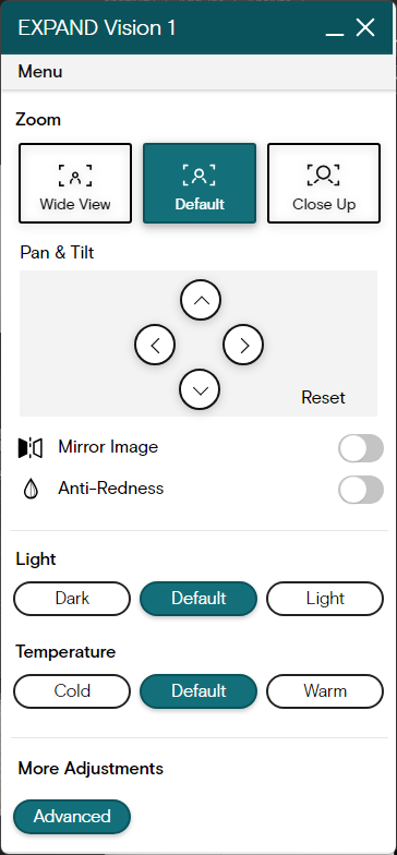 EPOS Connect: EPOS Connect helps manage the Expand Vision 1. It offers firmware updates, product information, and customization features like Zoom options (Wide View, Default, and Close Up), Pan and Tilt, Mirror Image, Anti-Redness, Light (Dark, Default, Light), Temperature (Cold, Default, Warm), and more adjustments including manual Zoom, Brightness, Contrast, Hue, Saturation, Sharpness, Exposure Compensation, White Balance and Anti-Flicker. This will ensure your camera is always functioning optimally.
